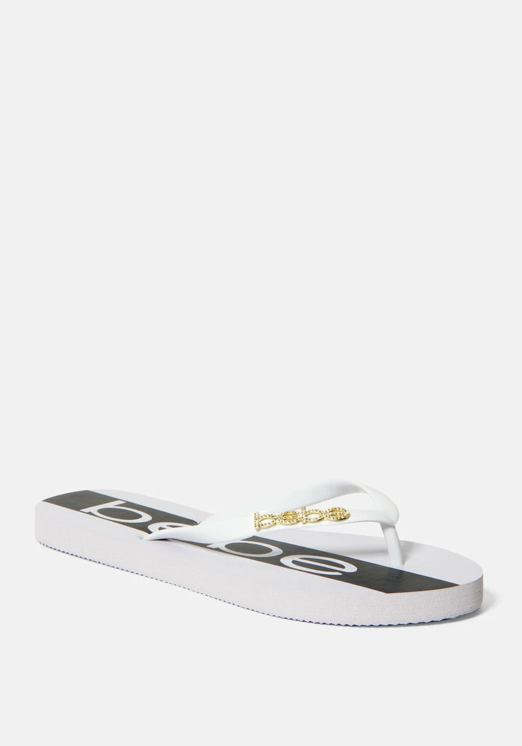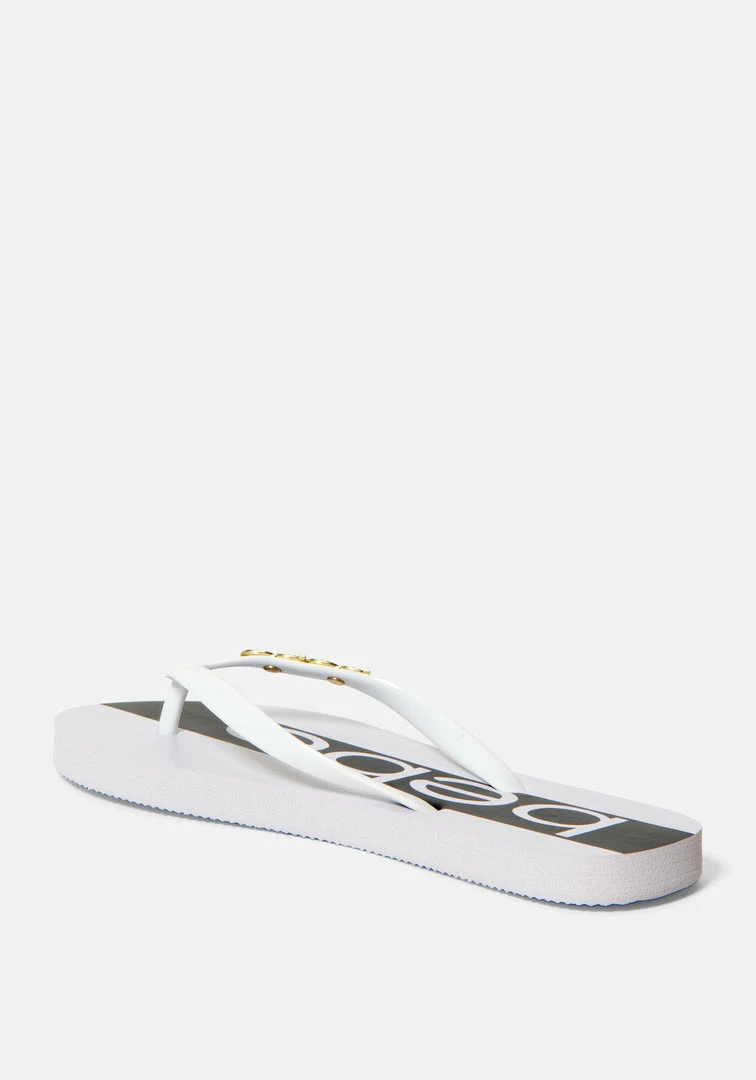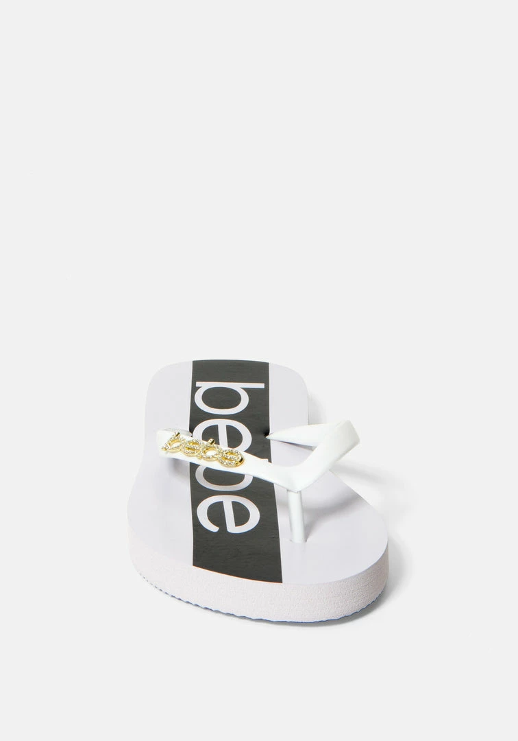 Comfortable slip-on thong sandal embellished with a bebe logo emblem. Lightly cushioned footbed with wide stripes and brand name