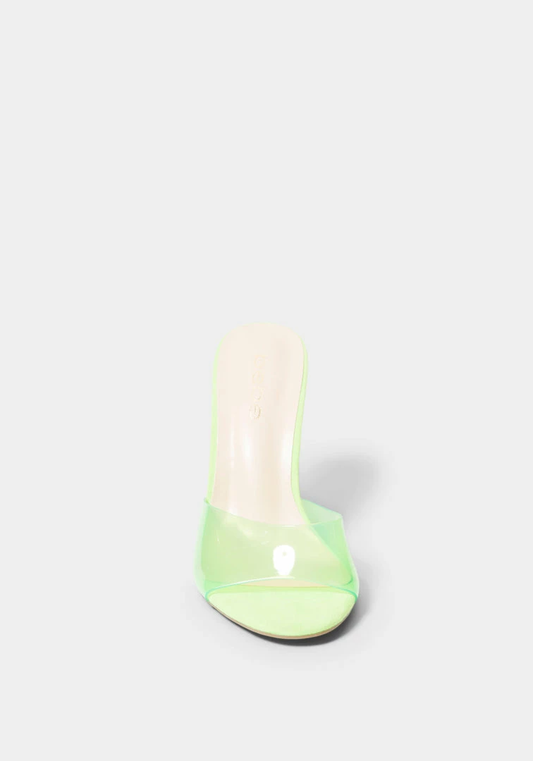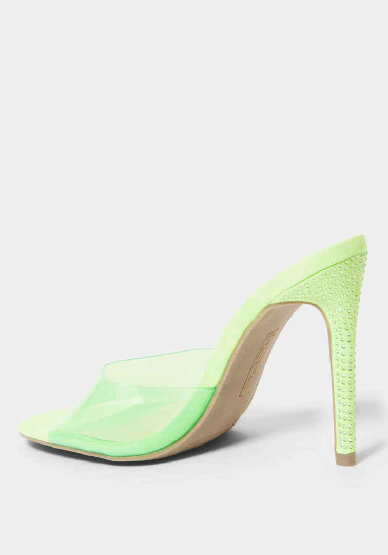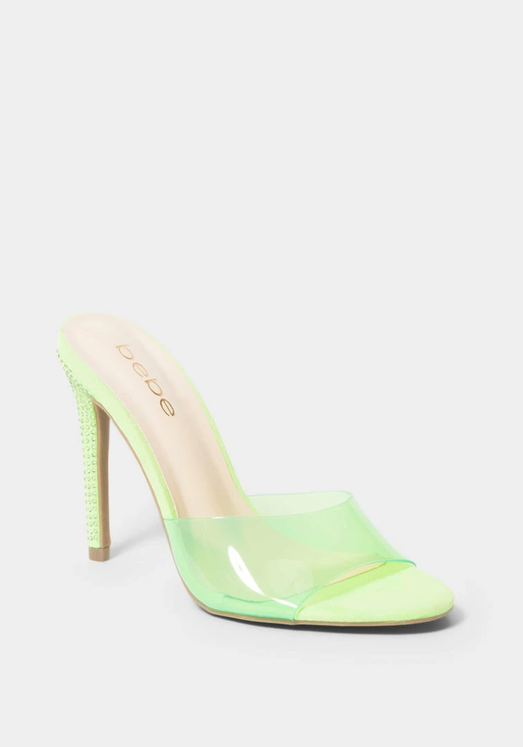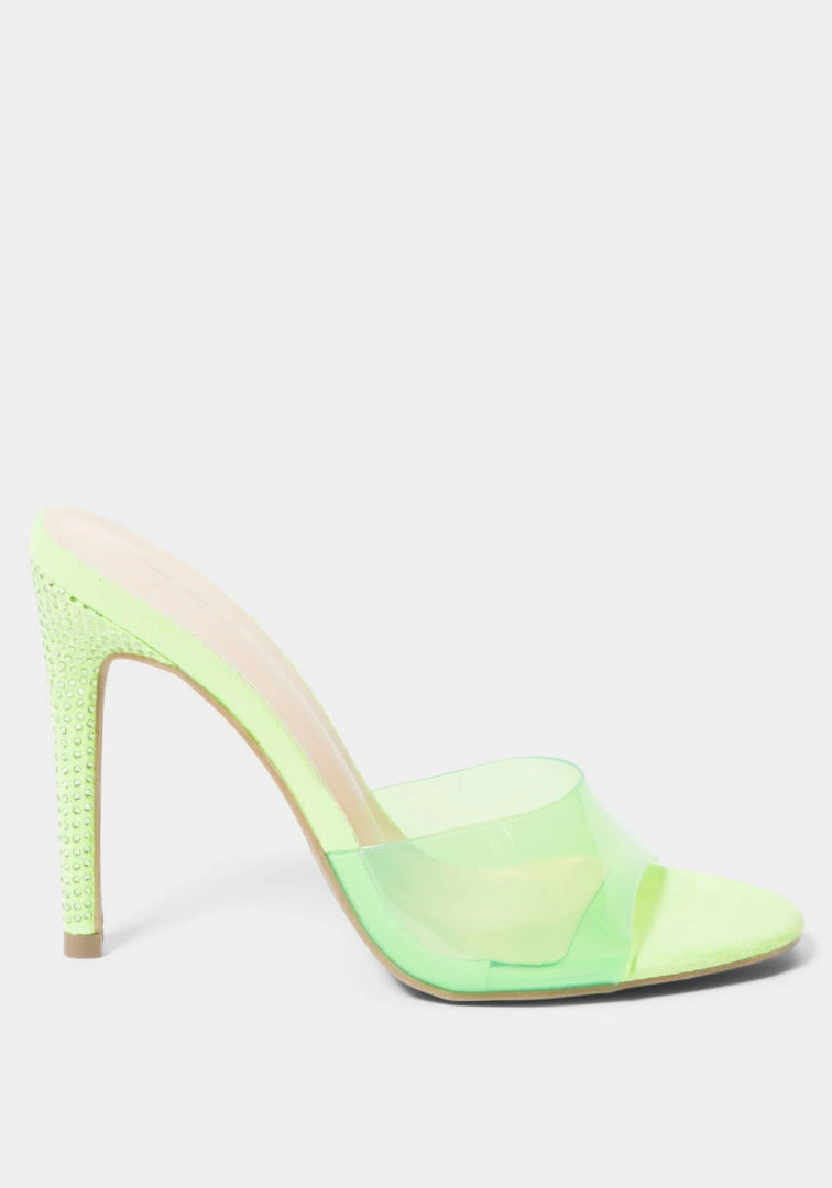 A glossy mule sandal features a translucent vamp and a stiletto heel with a playful studded design.