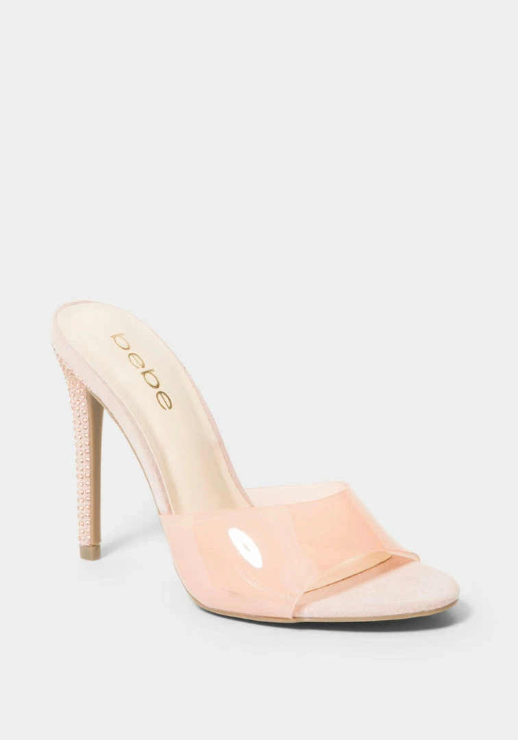 A glossy mule sandal features a translucent vamp and a stiletto heel with a playful studded design.