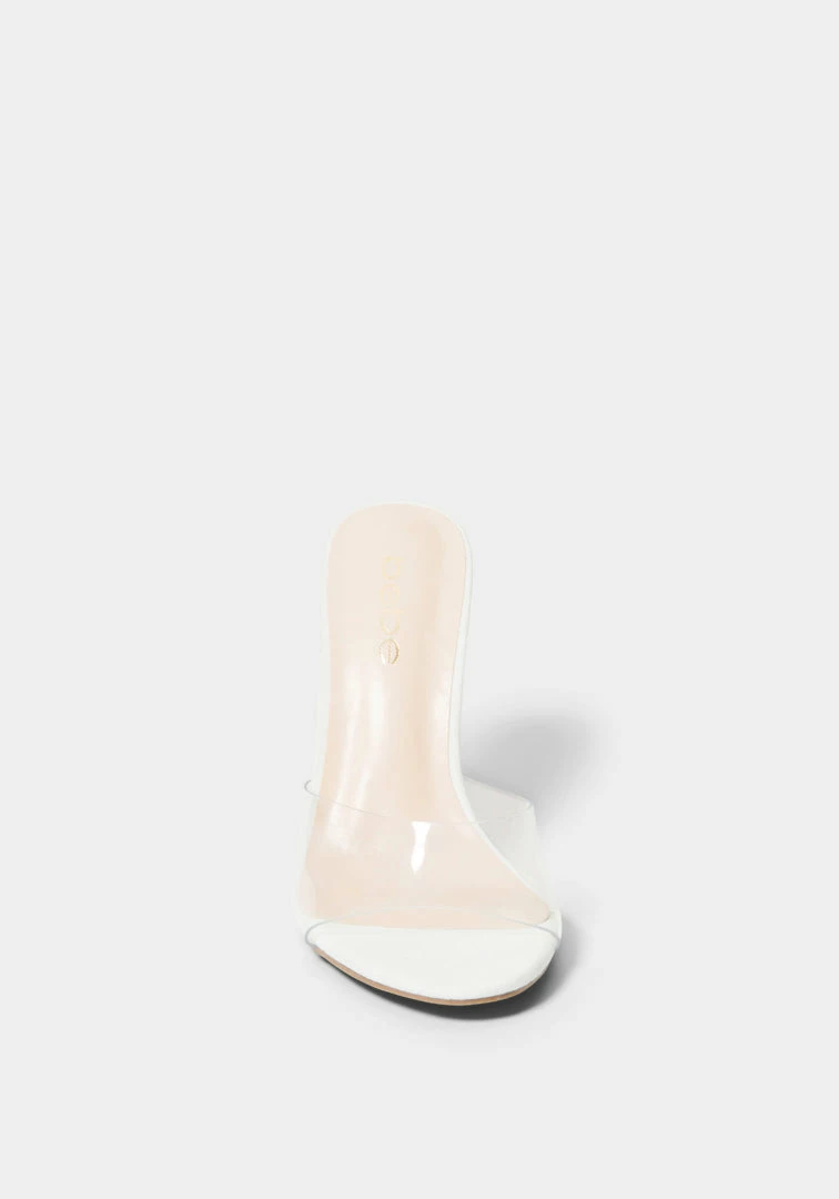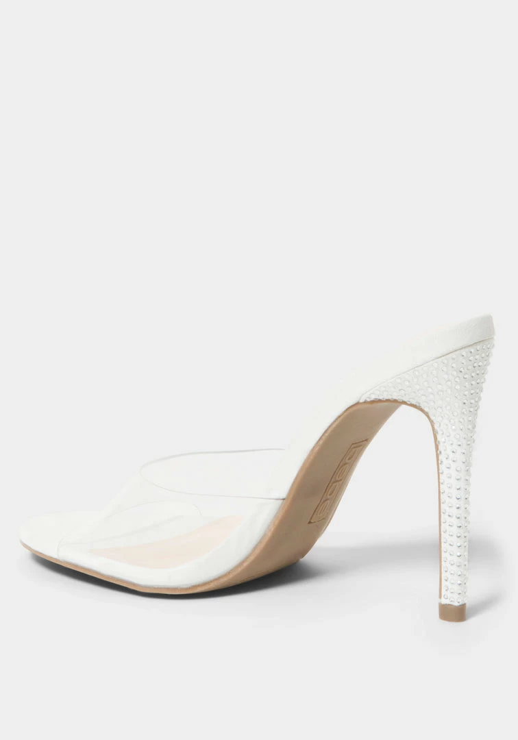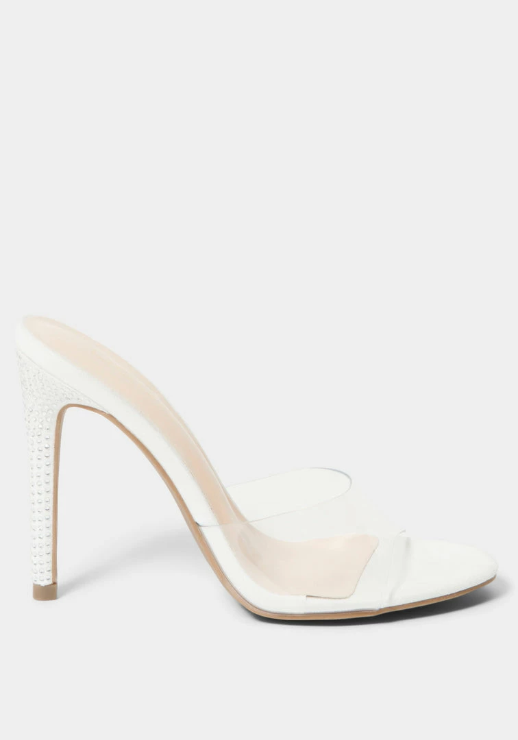 A glossy mule sandal features a translucent vamp and a stiletto heel with a playful studded design.