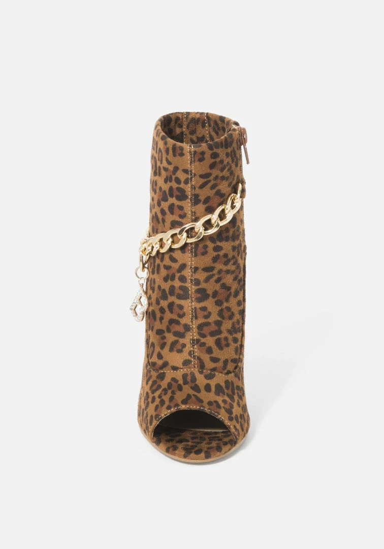 These boots were made for flaunting – and that’s just what they’ll do. The peep-toe style rocks a spike heel and a wraparound chain embellishment accented with a bedazzled B charm.