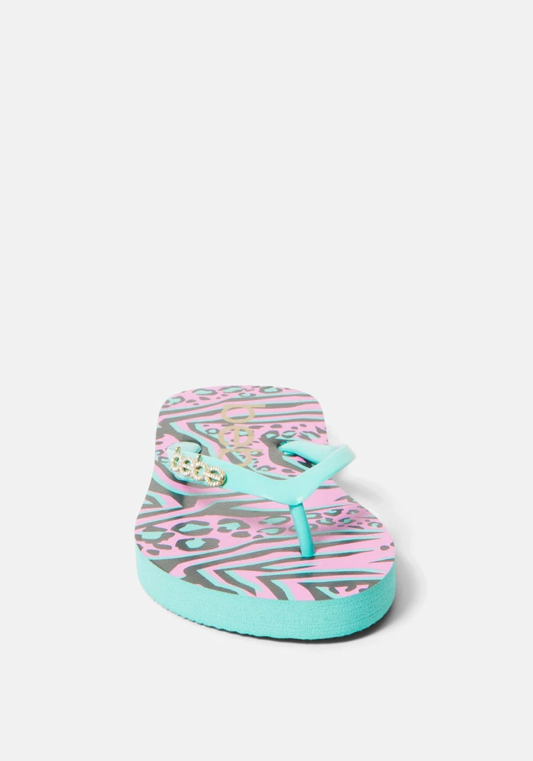 Add some style to your sunny day look with these chic flip-flops. Accented with a sparkly Bebe logo.