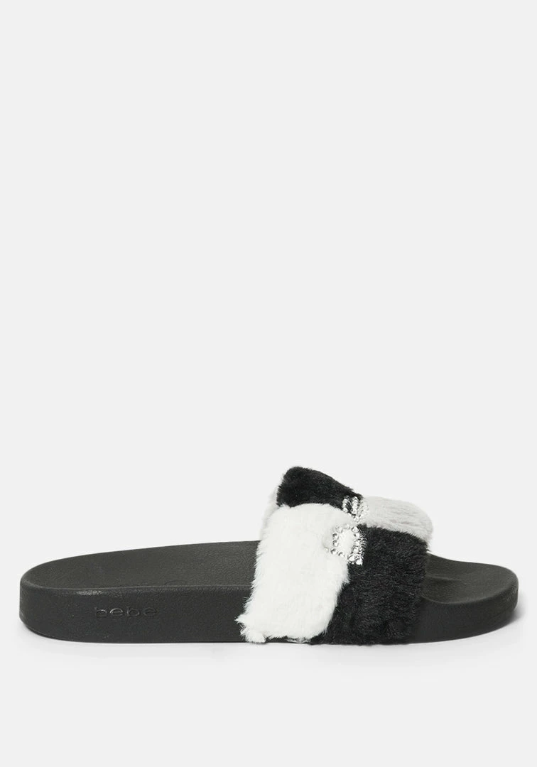 Ultra-fluffy, comfortable, and easy-to-wear, these slides will be your go-to style. Crystal logo in fashionable plaid faux fur pattern.