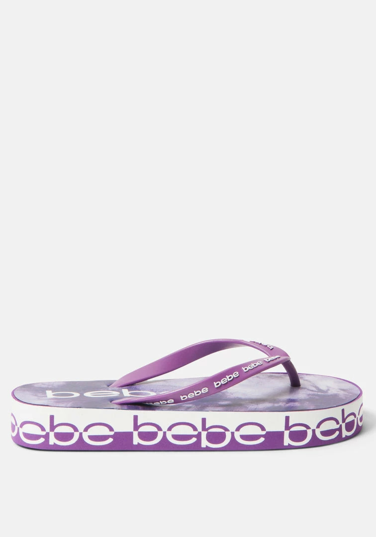 These platform flip-flops lifted by a cushioned platform feature an all-around Bebe logo. Perfect for lounging or brunching.