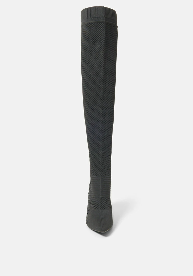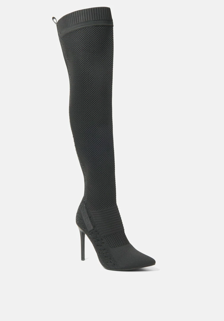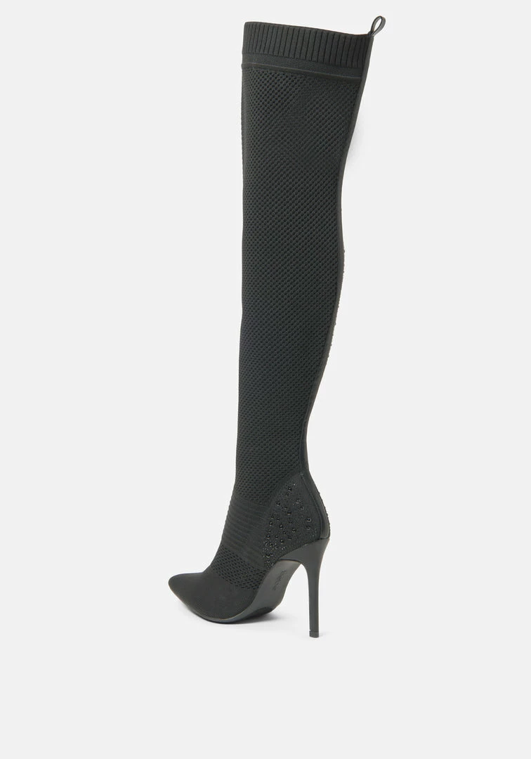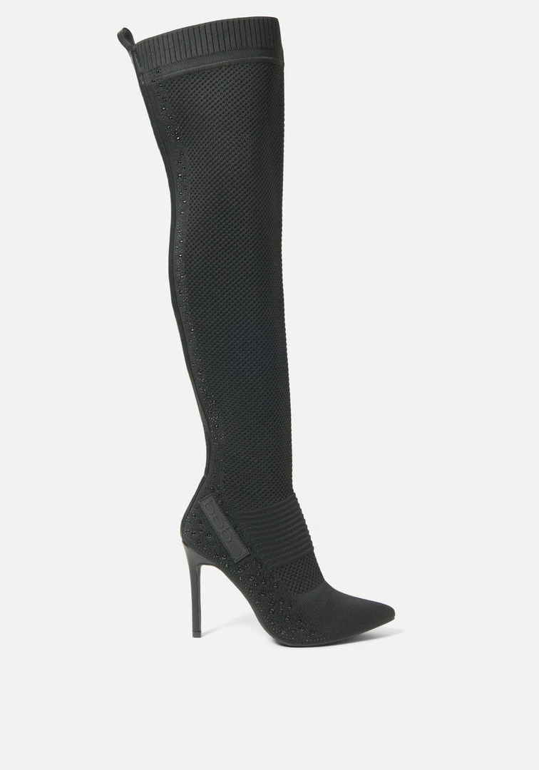These knee-high boots are a must in every wardrobe. Featuring a striking stiletto heel and glittering rhinestones that elevate these bold boots.