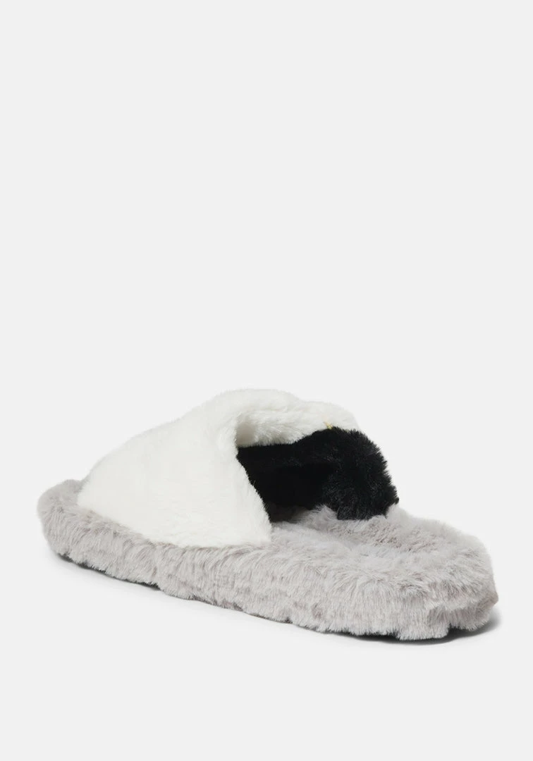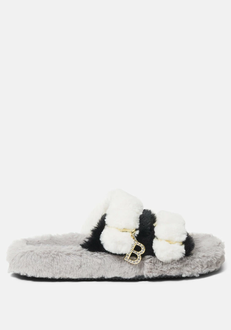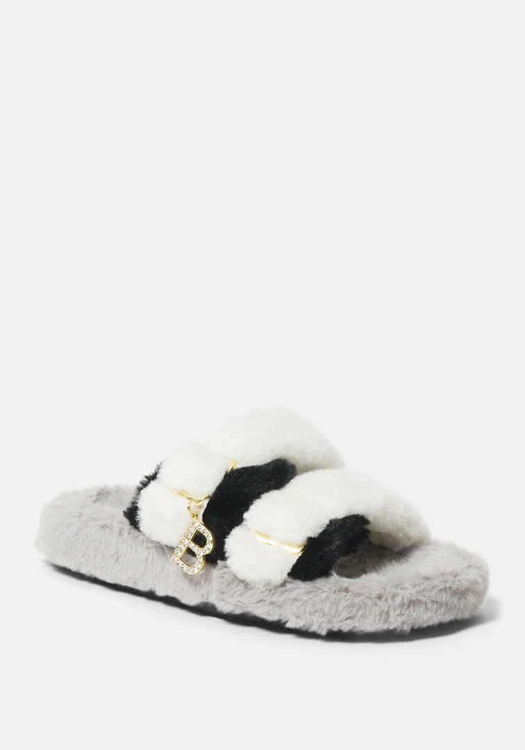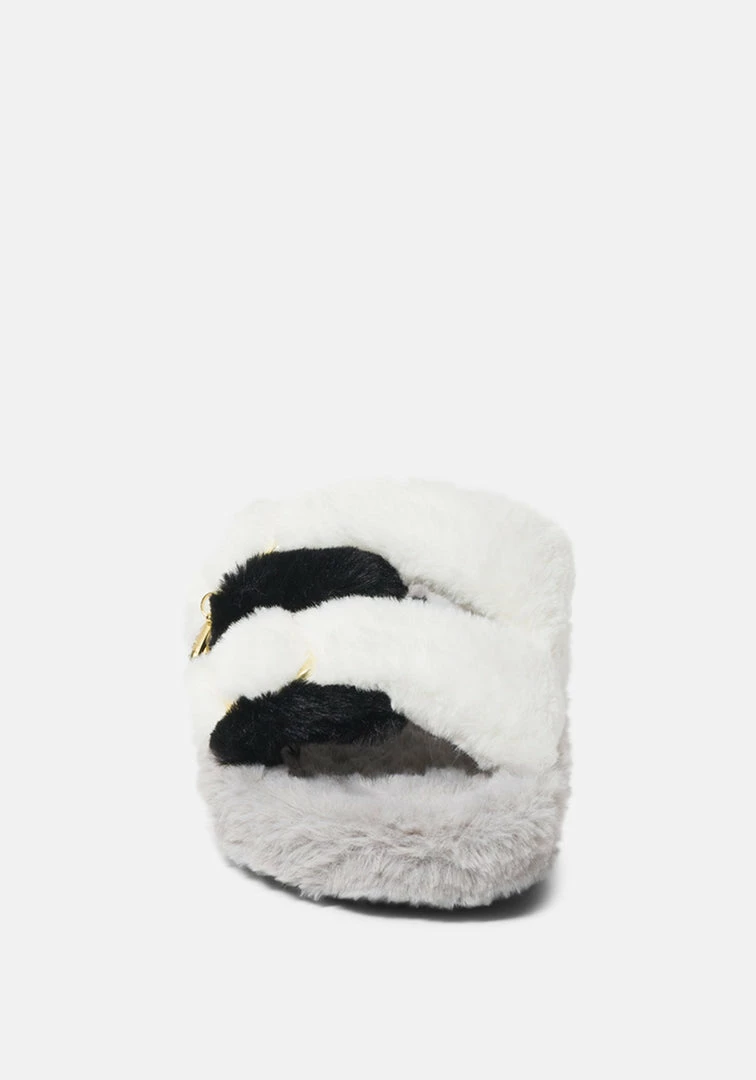 Lounge in style in these faux-fur slippers that feature two chunky straps running parallel across the foot.