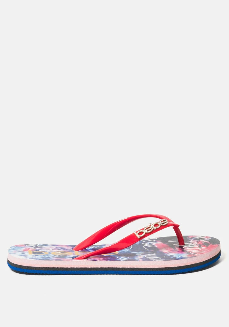 This playful summery flip-flop features a studded Bebe logo on the strap and a Bebe-patterned footbed.