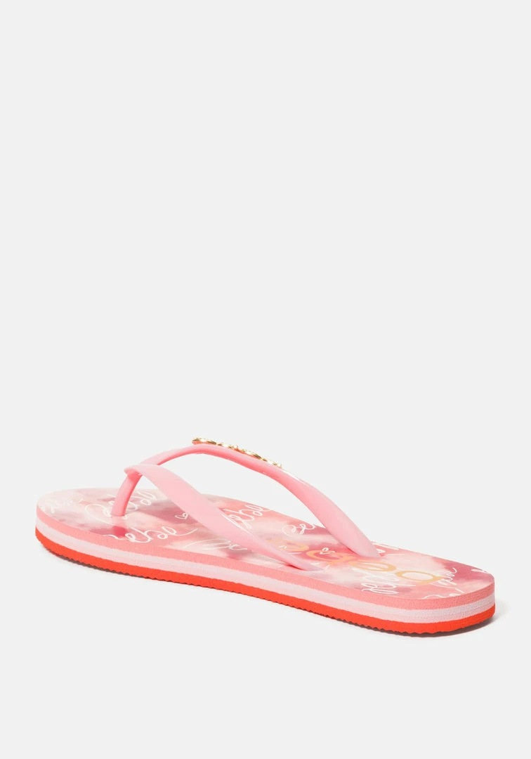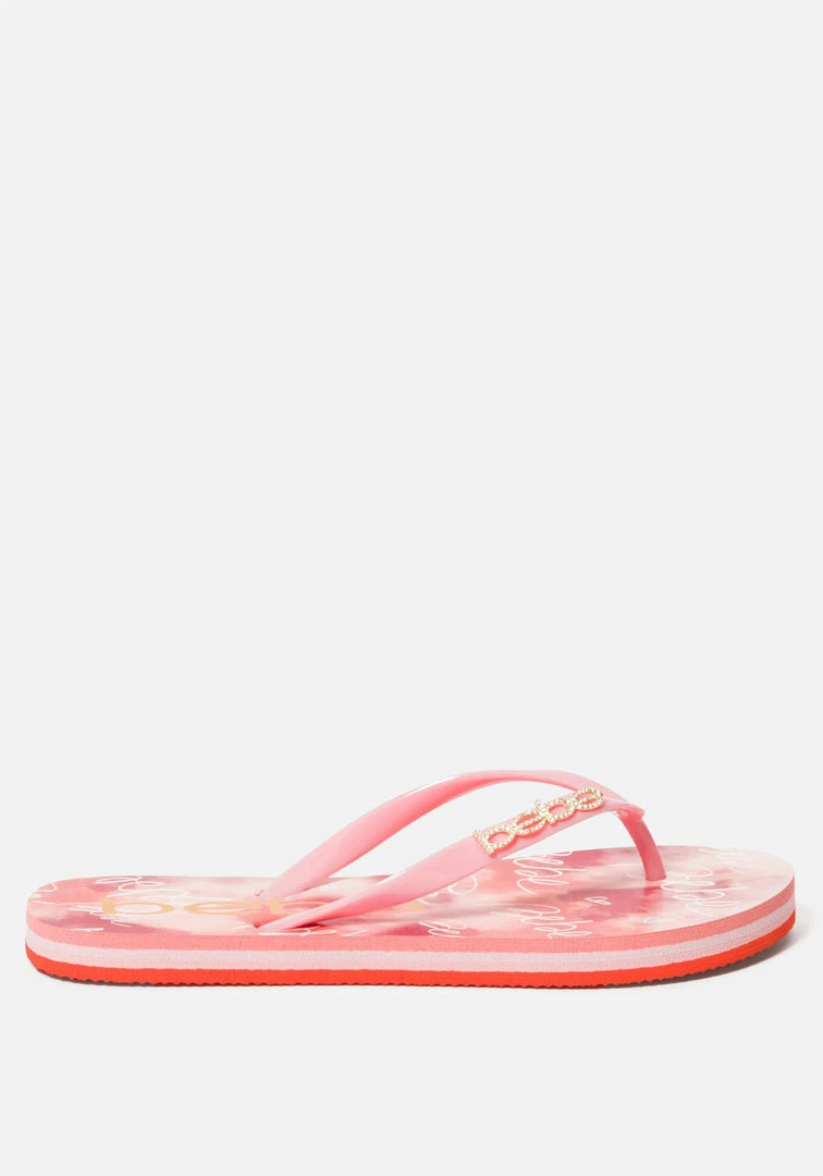 This playful summery flip-flop features a studded Bebe logo on the strap and a Bebe-patterned footbed.